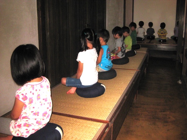 音体指導たたずまい教育は、美しい姿勢と体育リズム・リトミック・朗読と瞑想などの最も基本的な「心とからだづくり」から始まります。よく耳で聞いて、目で見て、指先まで意識することは、子ども達の身体能力を発達させます。当園には、日本太鼓指導者ライセンスを取得している保育士がおりますので本格的な指導を行っています。また、年に数回、全日本幼児教育連盟からも講師を招き指導しております。